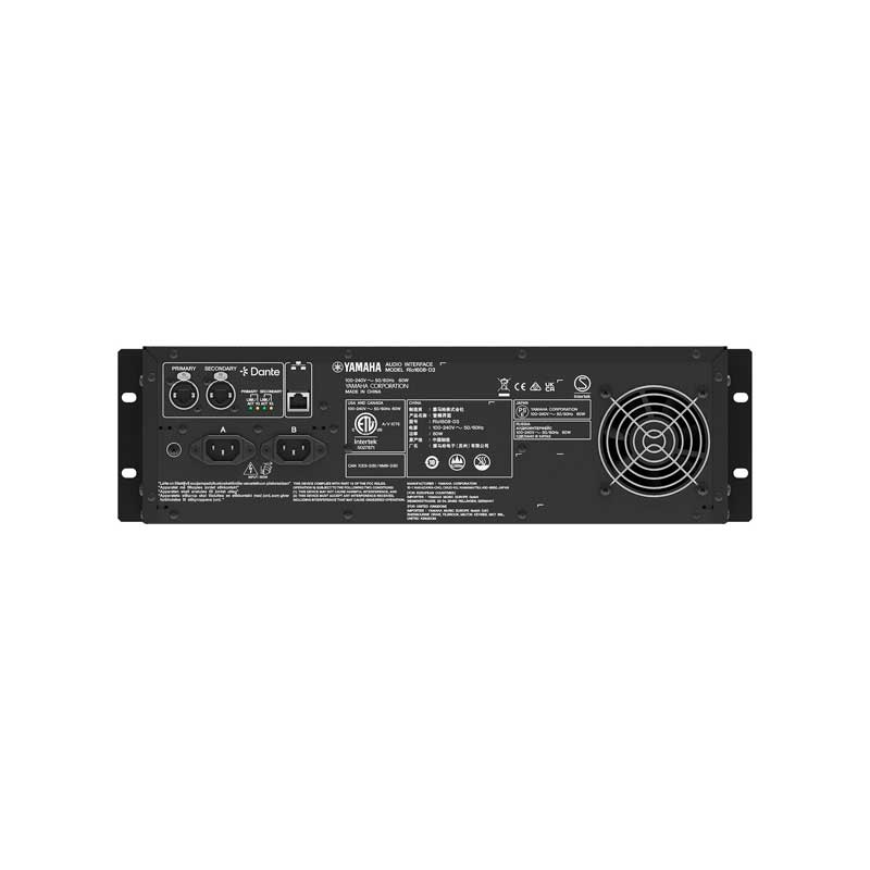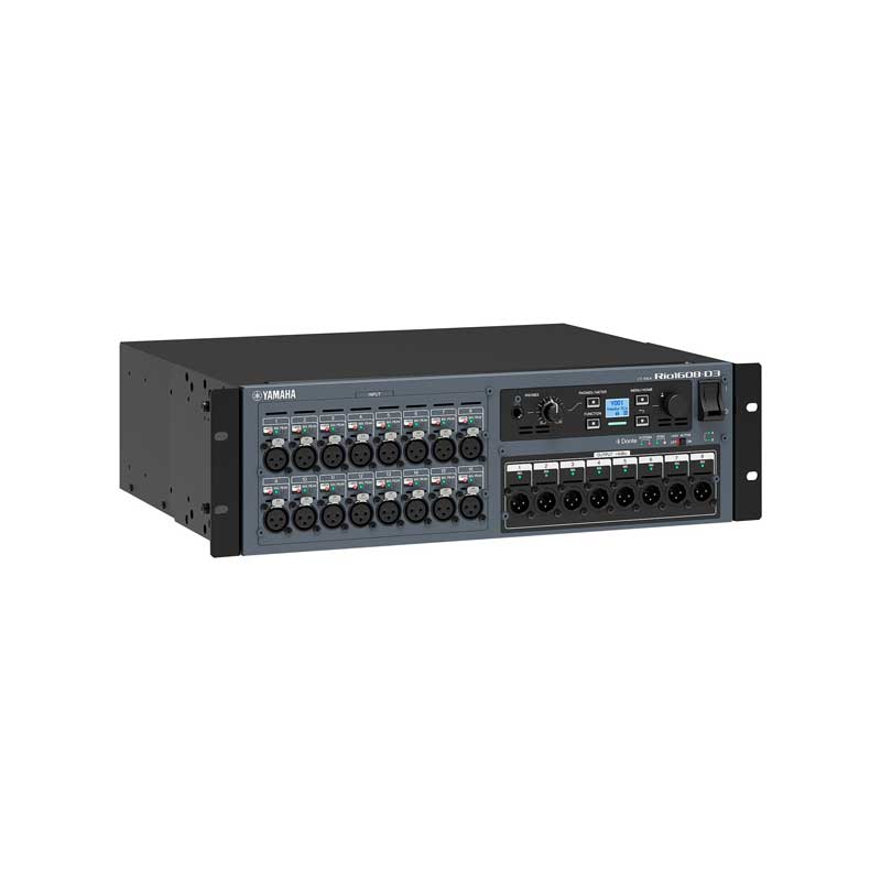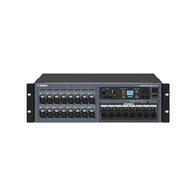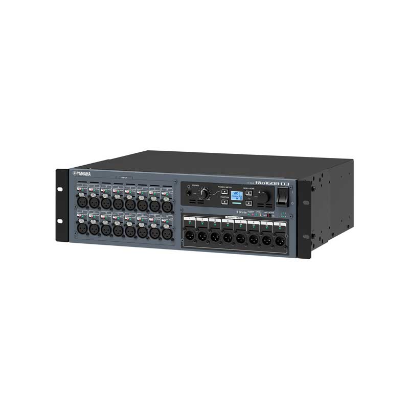 The Yamaha Rio1608-D3 Dante-compatible unit features 16 analog inputs and 8 analog outputs, enabling flexible system configuration with Yamaha digital mixers and processors.