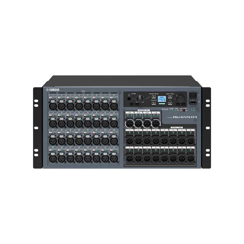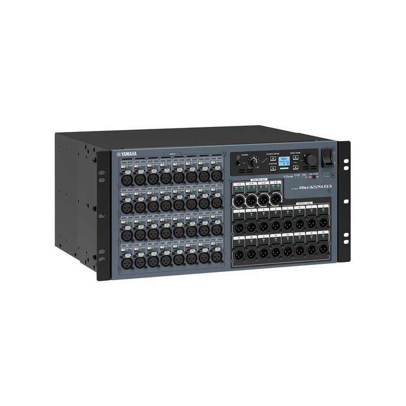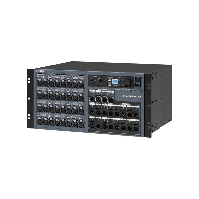 The Yamaha Rio3224-D3 Dante-compatible unit features 32 analog inputs, 16 analog outputs, and 8 digital AES/EBU outputs, enabling flexible system configuration with Yamaha digital mixers and processors.